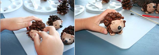 باستخدام الفرشاة، ضع البودرة على خدود القنفذ وأذنيه. إذا كنت قد قمت بنحت الأجزاء من الطين، أرسل القنفذ ليخبز في الفرن. قد تحتاج إلى الغراء إذا انفصل أي جزء أثناء عملية التسوية بسبب توسع الأكواذ.