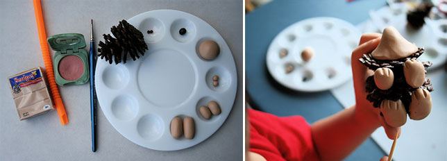 شكل الأنف والعينين. في الدرس تم استخدام الطين البوليمري للأنف والخرز للعينين.