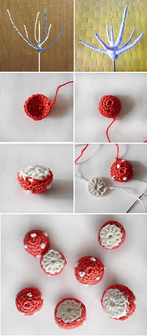 - Omotejte drát kolem špejle - to budou nohy hub. Na drát ovíjejte přízi požadované barvy, měla jsem starou chlupatou vlnu. Možná bude potřeba něčím přilepit.