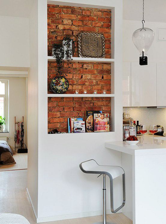 Chci použít cihlu v interiéru. Od stavitelů v bytě 1+1 zůstala nezpracovaná a nezakrytá pracovní cihlová stěna v kuchyni. Tato stěna vypadá tak stylově a loftově, že jsem se rozhodla vzdát tradičních kachliček na kuchyňské zástěně a soustředit se na zpracování cihel.