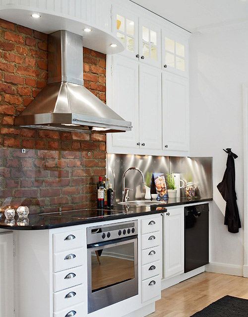Ráda bych se podělila o několik dokončených projektů kuchyní s cihlovými stěnami. Hliněný terakot ideálně ladí s bílým kuchyňským nábytkem a střídmou úpravou ve skandinávském stylu. Harmonizuje také barva oceli (domácí spotřebiče) a bronz (v kování). Zajímavě se kombinuje cihlová barva s tmavým nábytkem, ale kontrastujícím v odstínech - tmavě zelenou a dokonce černou. Při výběru tmavých povrchů by však mělo být místnost prostorné a světlé, s vysokým stropem.