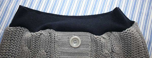 Aquí hay un par de fotos de un modelo similar de suéter con botones. La cinturilla de punto se une a la tela de punto con zigzag o con una overlock.