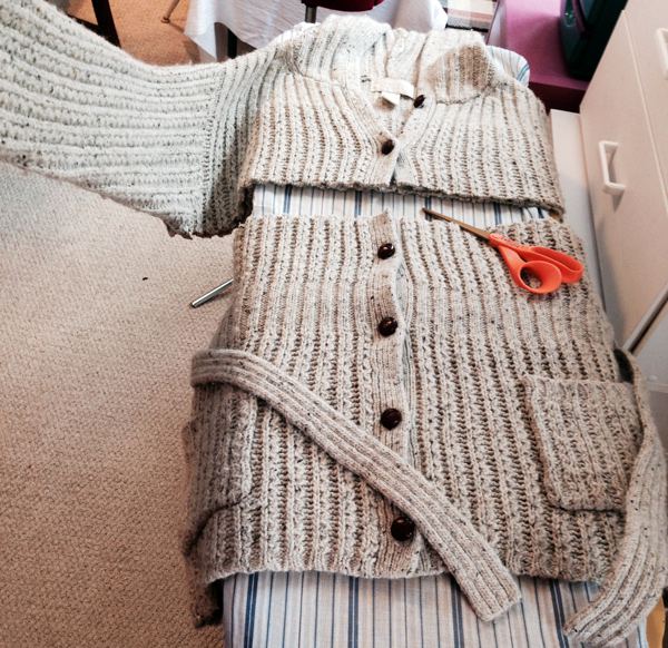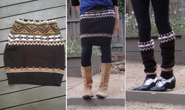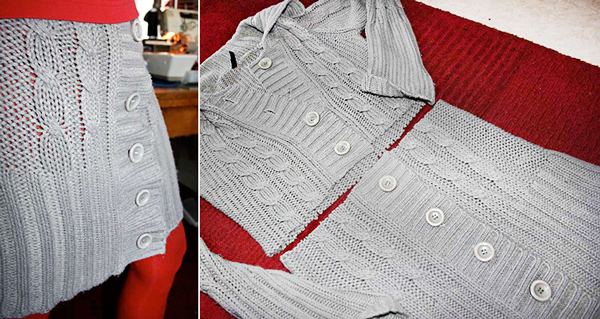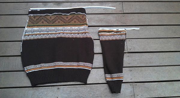 Modelo 2. De un suéter viejo se puede hacer un conjunto: una falda y calentadores de brazo con las mangas. Es una ventaja si el suéter se puede filtrar un poco, ya que será mucho más fácil trabajar con él.