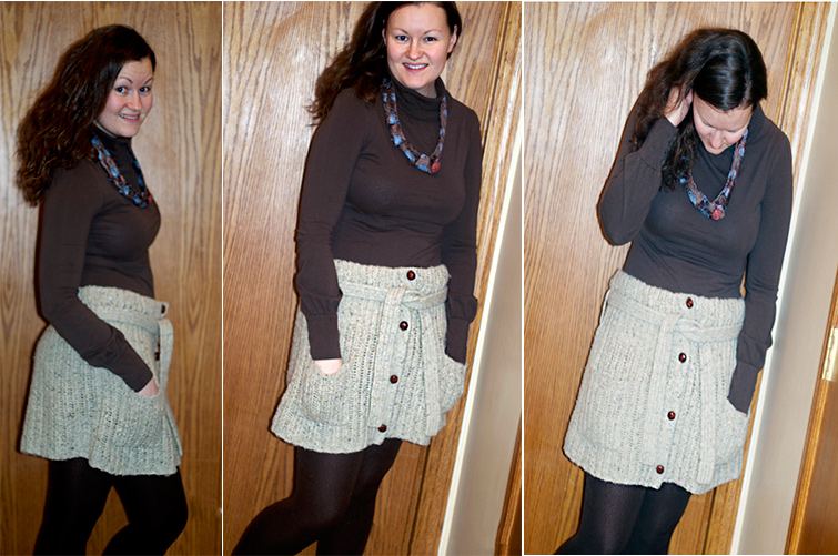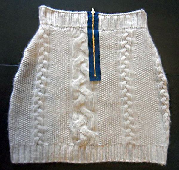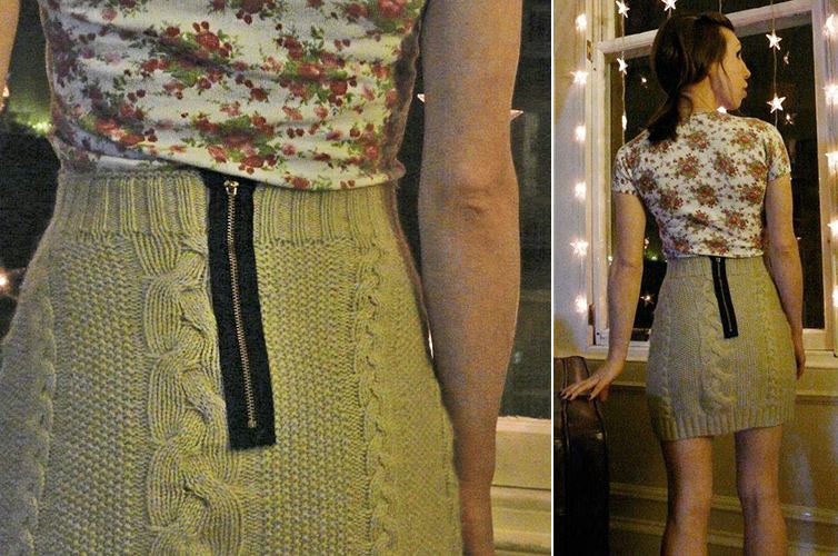 Modelo 3. Una opción audaz: una falda hecha de un snood con una cremallera contrastante. Se puede hacer lo mismo con un suéter; solo que la goma inferior podría funcionar mejor en la cintura, y el borde puede ser tejido nuevamente, o doblado y cosido con una goma suelta para solo fijar la forma. El autor de la idea dice que el snood que le regalaron en Navidad se ve mucho mejor como falda. ¡Difícil de discutir!