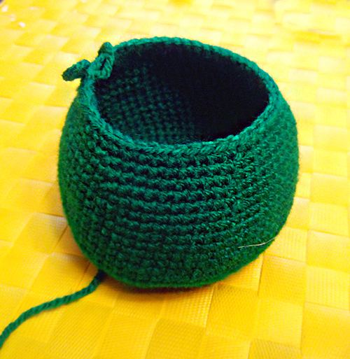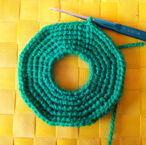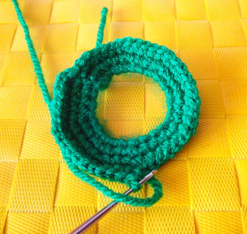 ردیف ۱: ۳ پایه بدون تو رفته و یک پایه افزایشی در سومین زنجیره درست میکنیم، ۳(+۱) را تا انتهای حلقه تکرار میکنیم و ردیف را میبندیم. سپس یک زنجیره برای بالا رفتن، همانطور که در هر ردیف تمام شده است، بافته میشود. ردیف ۲: ۴ پایه بدون تو رفته و یک پایه افزایشی در زنجیره ۴ با ۴(+۱). ردیف ۳: ۵(+۱) ردیف ۴: ۶(+۱) ردیف ۵: ۷(+۱) از ردیف ۶ تا ۱۵ بدون افزایش میبافیم.