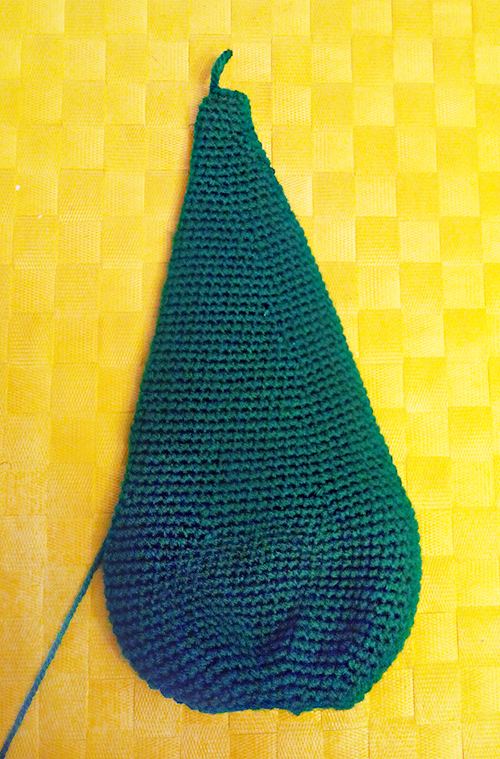 سپس به تدریج درخت گلابی شکل را باریکتر میکنیم. ردیف ۱۶: ۲۰(-۱)، باید ۳ کاهش در این ردیف انجام شود. ردیف ۱۷: ۱۰(-۱)، ۱۹(-۱)، ۱۹(-۱). در این صورت، محلهای کاهش در ردیفها به صورت شطرنجی خواهند بود. این تکنیک از کج شدن و ایجاد حفرههای مشخص در بافت جلوگیری میکند. ردیف ۱۸: ۱۸(-۱) ردیف ۱۹: ۹(-۱)، ۱۷(-۱)، ۱۷(-۱) ردیف ۲۰: ۱۶(-۱) ردیفهای ۲۱ تا ۲۵ بدون کاهش. ردیف ۲۶: ۱۵(-۱) ردیفهای ۲۷ و ۲۸ بدون کاهش. ردیف ۲۹: ۱۴(-۱) ردیفهای ۳۰ و ۳۱ بدون کاهش. ردیف ۳۲: ۱۳(-۱) ردیفهای ۳۳ و ۳۴ بدون کاهش. ردیف ۳۵: ۱۲(-۱) ردیفهای ۳۶ و ۳۷ بدون کاهش. ردیف ۳۸: ۱۱(-۱) ردیفهای ۳۹ و ۴۰ بدون کاهش. ردیف ۴۱: ۱۰(-۱) ردیفهای ۴۲ و ۴۳ بدون کاهش. ردیف ۴۴: ۹(-۱)
