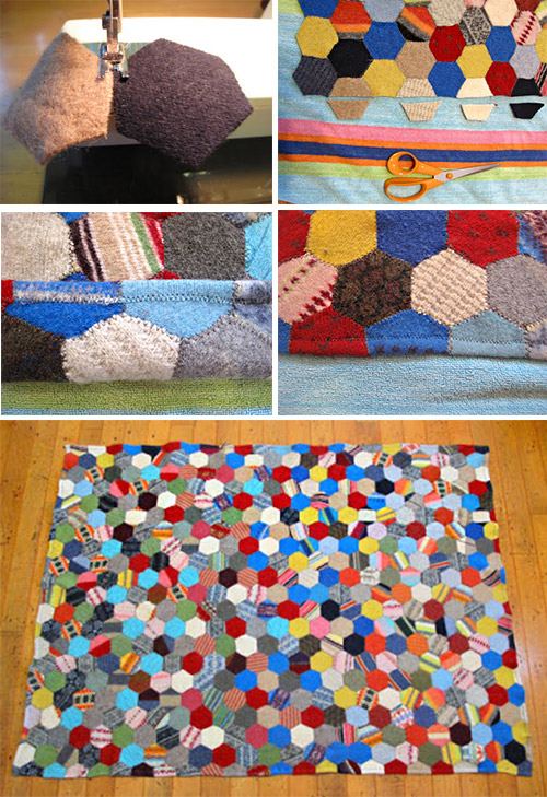 پتو چشمگیر از سوئیشرتها. نسبتاً زمانبر در اجرا، اما این ششضلعیهای کوچک میتوانند هرگونه زباله پشمی را استفاده مجدد کنند.