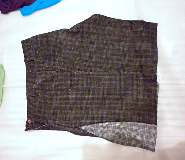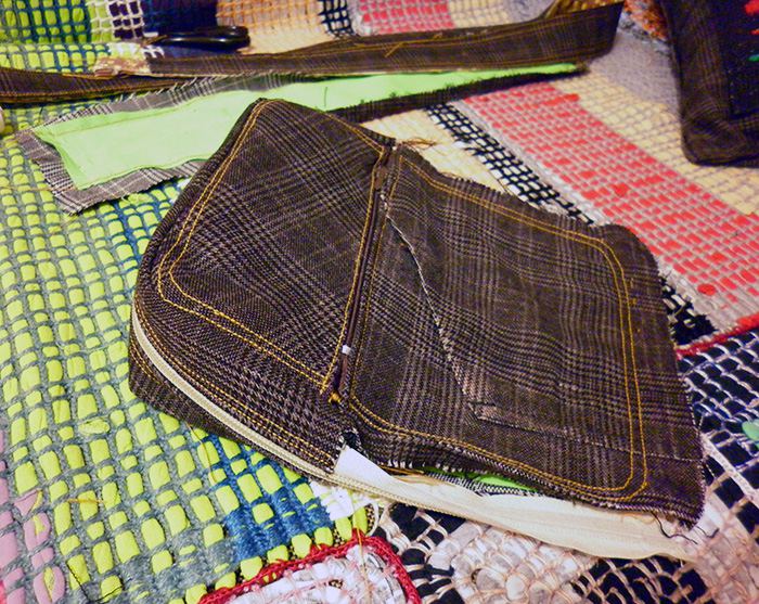- Ompelin osat housuista, jättäen pieniä saumanvaroja kankaan suurta purkautumista varten. Etupuolella oli vetoketjullinen tasku, päätin säilyttää sen, ja housuissa oli valmiina tasku, joten laukussa on nyt kaksi toiminnallista osastoa pääosaston lisäksi.