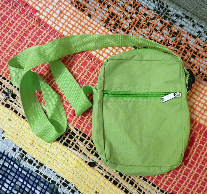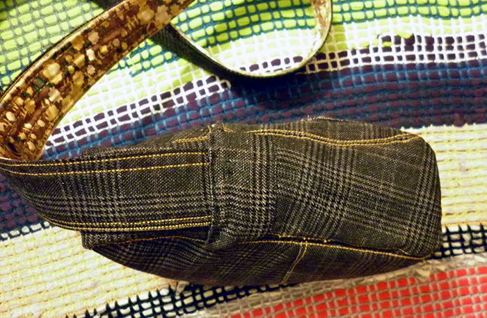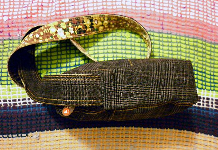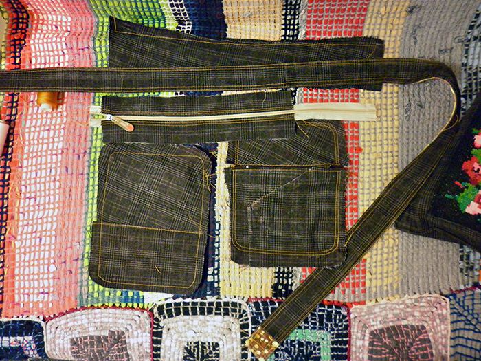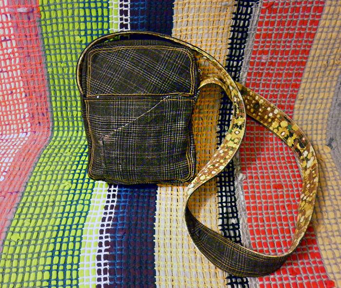 Kangaspalojen joukosta löytyi jäämiä ruudullisista housuista, joiden vyötäröosa päätyi laukun etupuolelle. Olkahihna vaihdettiin toisen eläkkeellä olevan laukun hihnaan, samaa voidaan sanoa vetoketjuista – ne ovat peräisin repusta ja housuista. Täydellinen kierrätys.