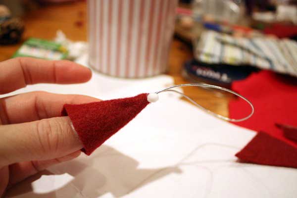 - टोपी के लिए फेल्ट से एक त्रिकोण काटें, लटकाने के लिए डोरी तैयार करें।