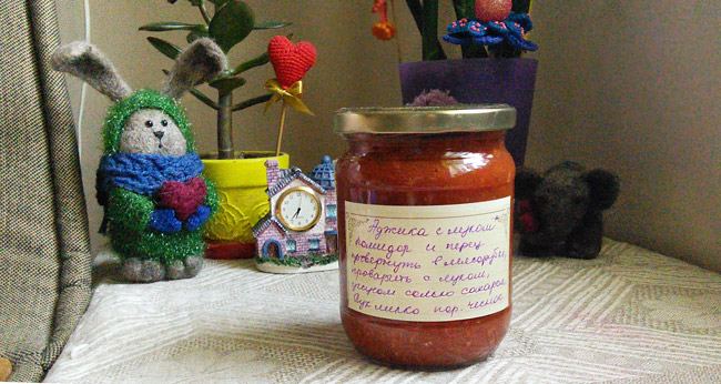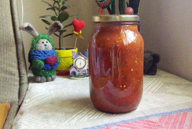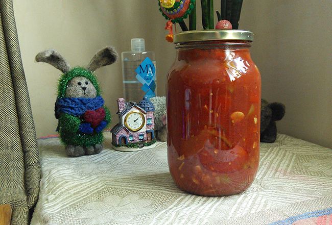 Na mesarstvu sam prošla rajčice i papriku u omjeru 2 prema 1. Prokuhala sam smjesu, dodala sitno sjeckanu zelje, bosiljak, klinčiće. Dodala sam malo octa za svaki slučaj i bogato posolila. Zatvorila sam u oprane staklenke sa sodom, bez sterilizacije.