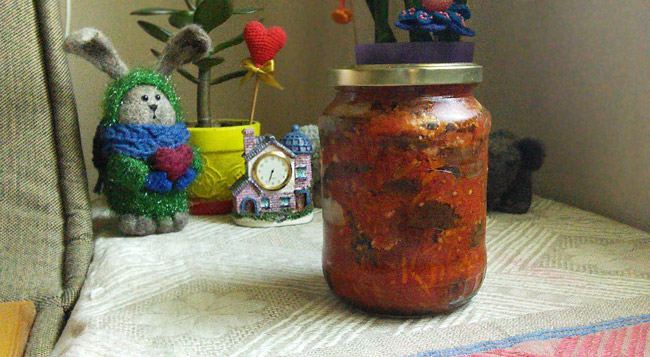 Veoma radno intenzivan recept i prosječan okus. Sterilizirala sam napunjene staklenke. Prženi patlidžani složeni su u slojevima, prekriveni umakom od rajčice s prženom mrkvom, lukom, češnjakom. Nekoliko sati na 4-5 staklenki, čuvam u hladnjaku za svaki slučaj. Ne preporučujem gubiti vrijeme na ovu opciju.