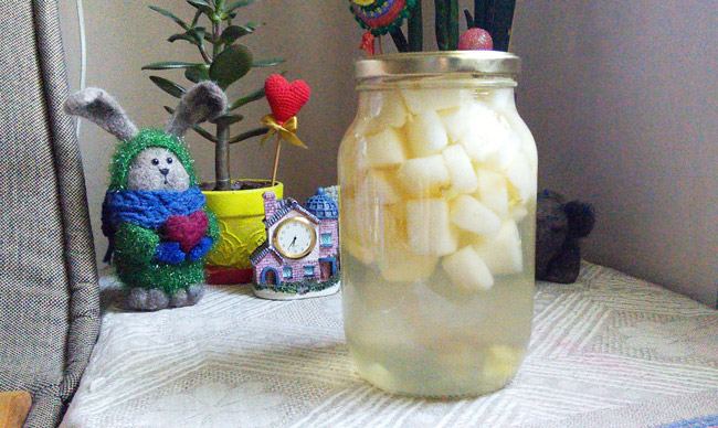 Sirup je isijavao nevjerojatan miris. Prelijevala sam narezane kruške kipućom vodom 2 puta, 3. i 4. put prelijevala sam sirupom. Đumbir sam stavila odmah. Opteretila sam se pa sam prelila četiri puta, jer su staklenke litarske i brzo se hlade, bolje je prelio još jednom.