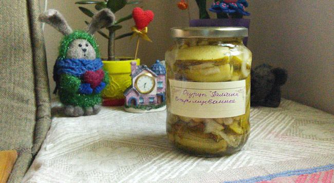 Jedan od najjednostavnijih i najukusnijih recepata. Tražite izvorni recept na Povarenci. Od sebe dodajem da sam obilato začinila svježim koprom i ružmarinom, bijelim paprom, origano. Tikvice se savršeno čuvaju, okus se može nazvati čak i sofisticiranim, za svečane stolove.