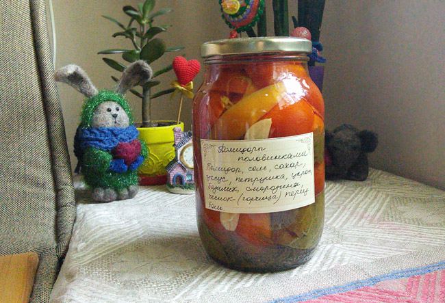 Dobar način da se iskoriste prekomjerno zreli, ukusni, ali sterilizacija izaziva stres. Ako imate velike bazene za tu stvar, onda nema problema, međutim, ne mogu stajati više od 4 pola litra staklenki u lonac, dolazi do mnogo posla. Zimi će biti jako ukusni uz krumpir. Tražite proporcije na Povarenci pod nazivom Ulet ili Prstići.