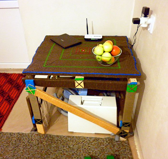 - Pribijemo pleteni stolnjak za daske namještajem spajalicom. Sada se stolić može čistiti samo usisavačem…