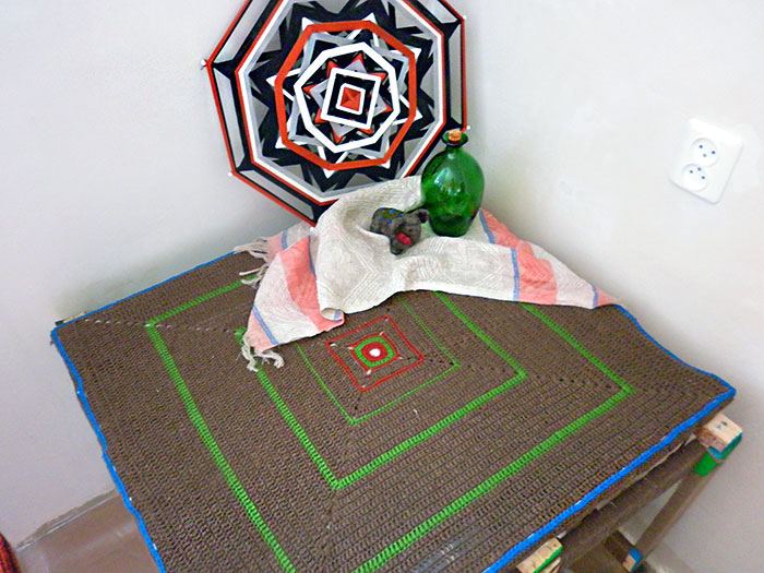 - Stolna površina je pletiva kuke, u obliku pravokutnika stupcima s navojem. Moglo se naći brže, praktičnije i manje zahtjevno rješenje, ali meni je bio važan proces opuštanja od pletenja, i u tom trenutku nisam smislila ništa bolje od toga da ispletem veliku nezaobilaznu salveta za stolić.