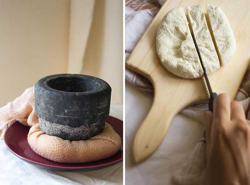 Preparazione del paneer con latte fresco e succo di limone. Peso da un mortaio.