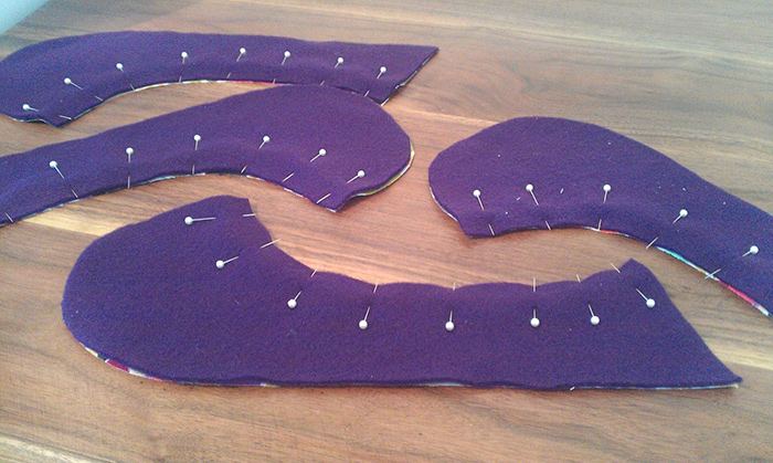 - Fissate con gli spilli (o imbastite, come preferite) con il lato dritto rivolto verso l’interno. Otterrete due pezzi leggermente più grandi e due leggermente più piccoli (B, C).