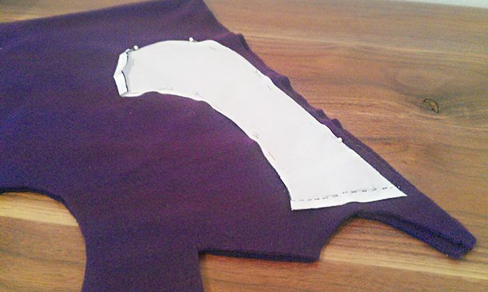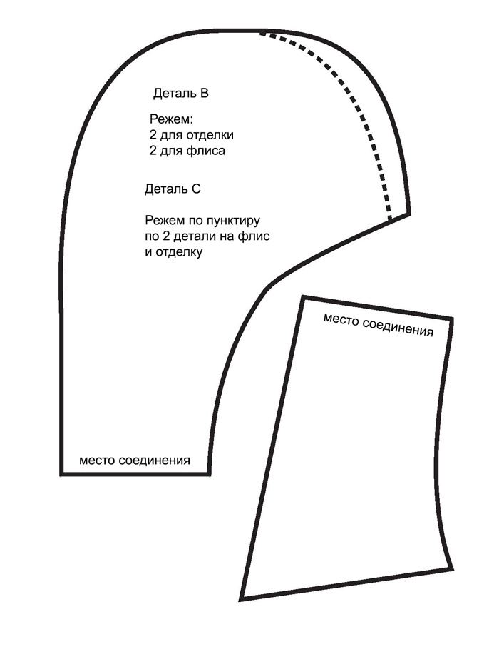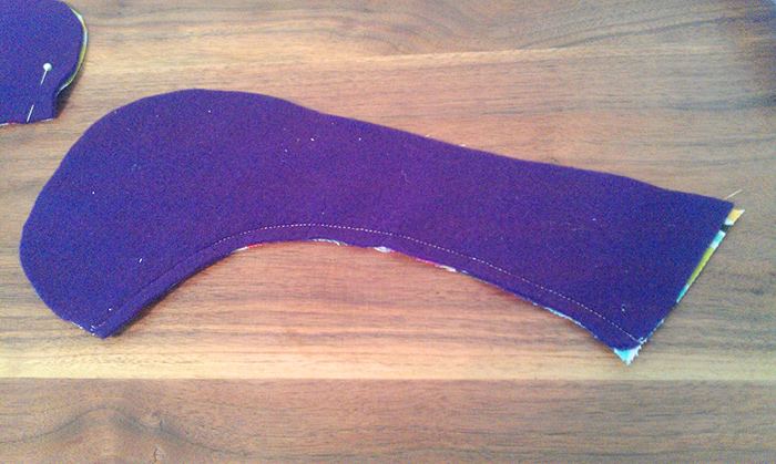 - Fissate sul pezzo interno A il pezzo B\C, con le parti esterne rivolte una verso l’altra, in modo che la cucitura posteriore coincida con il triangolo rosso (A, B, C).
