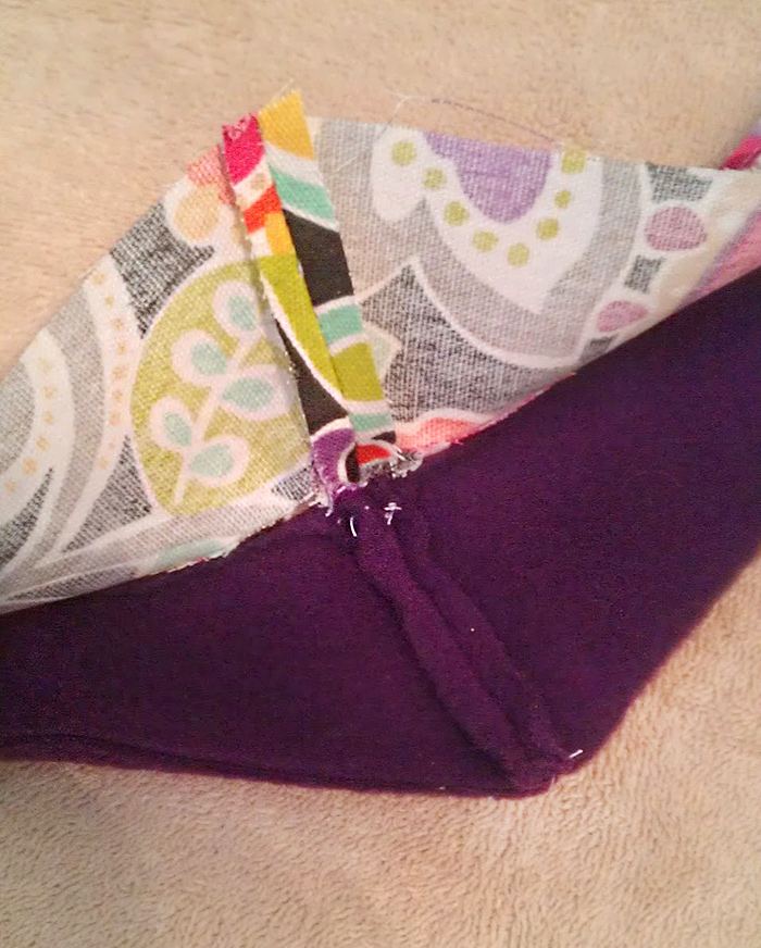 - Unite il lato esterno A a B\C con le parti dritto contro dritto. La cucitura posteriore deve coincidere con il triangolo rosso (A, B, C).