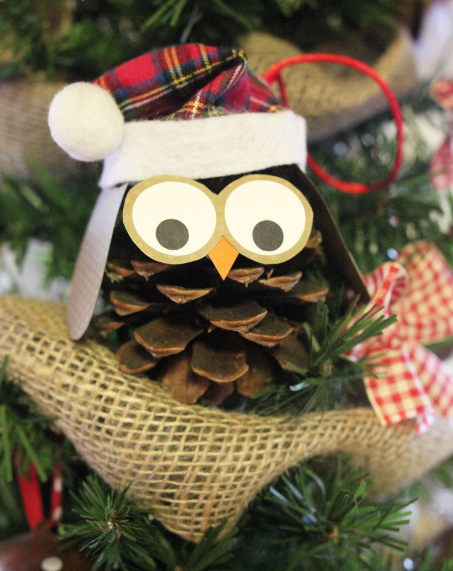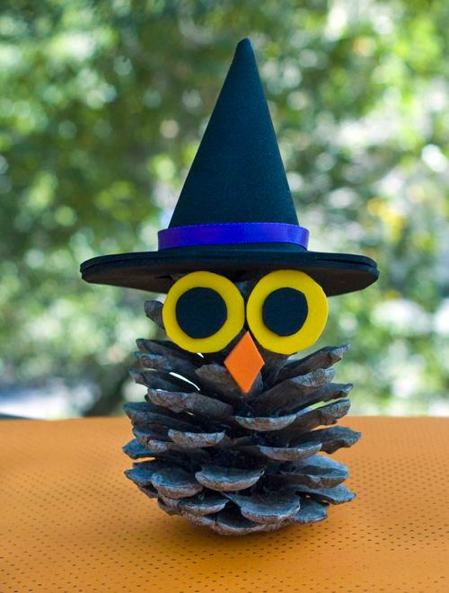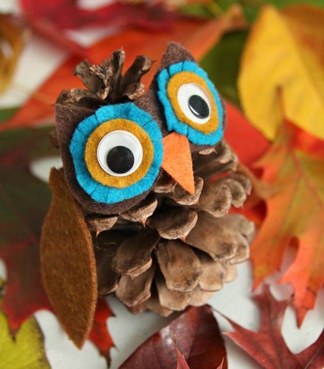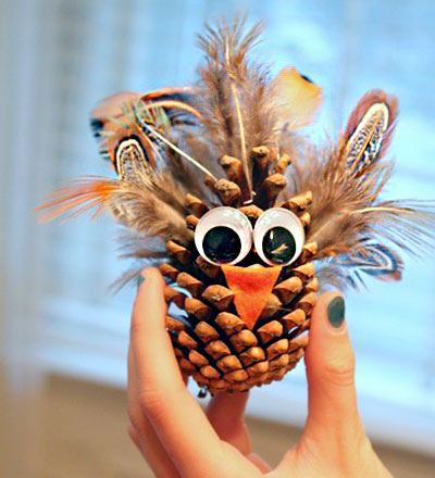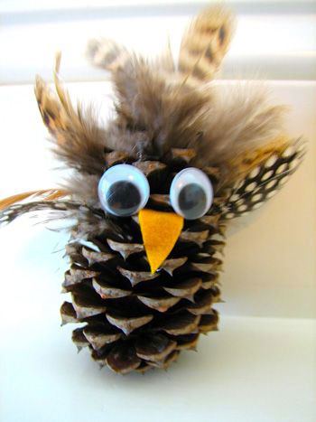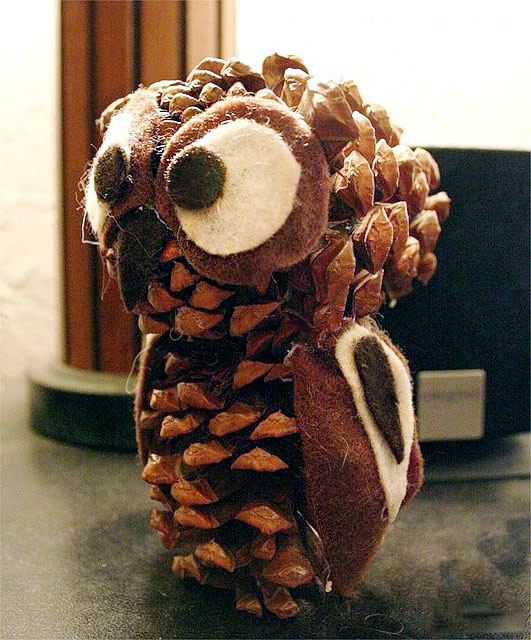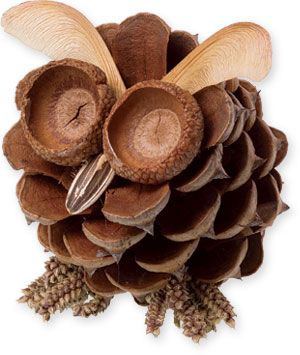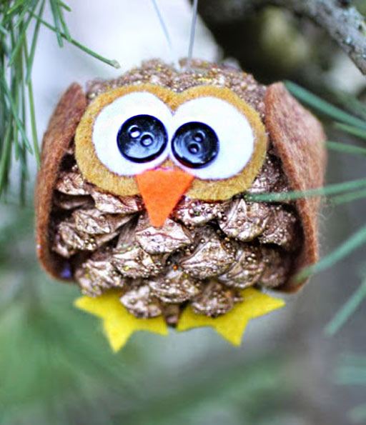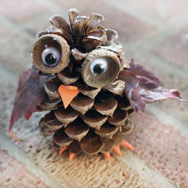 Un altro delizioso gufo realizzato con ghiande, pigne e foglie. Dovrete rimuovere un paio di scaglie legnose dalla pigna per posizionare bene gli occhi.