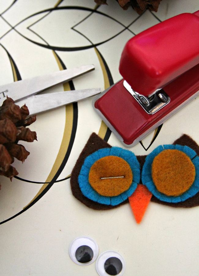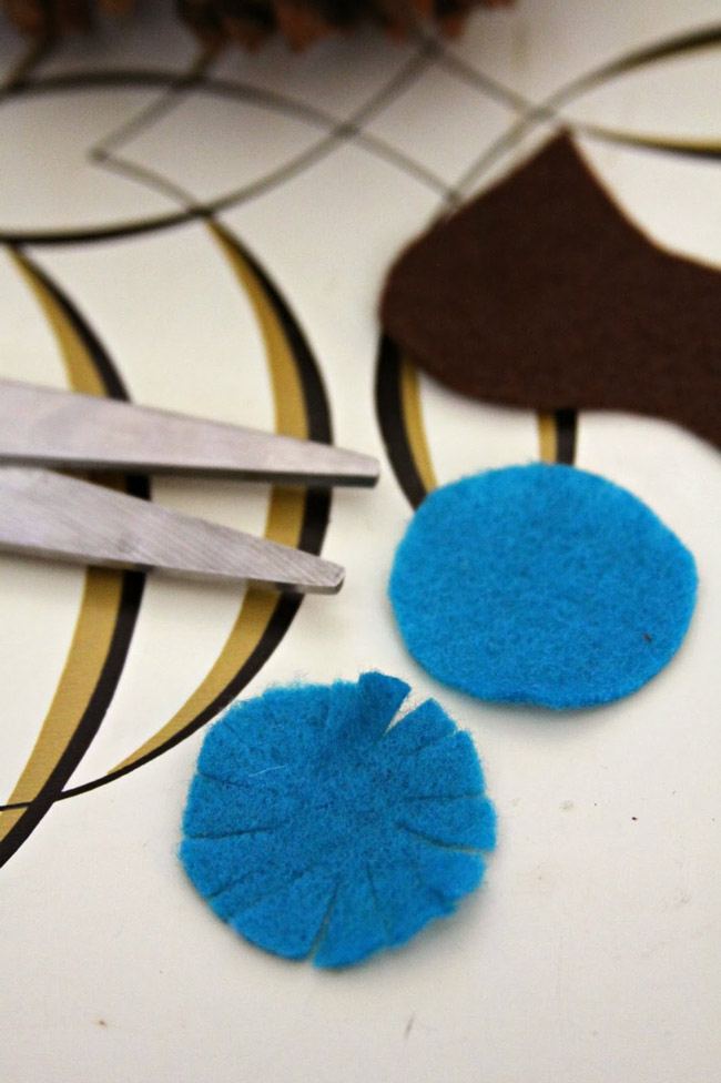 Scegliete diversi colori di feltro o realizzate cerchi a uncinetto di dimensioni e colori diversi. La dimensione delle sagome per gli occhi dipenderà dalla grandezza della pigna. Un altro tutorial è disponibile di seguito.