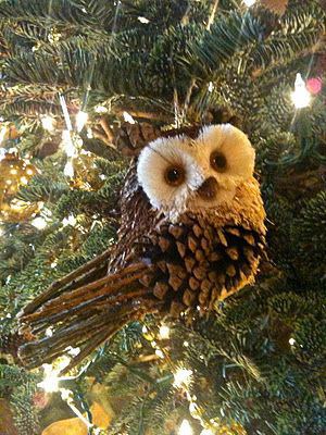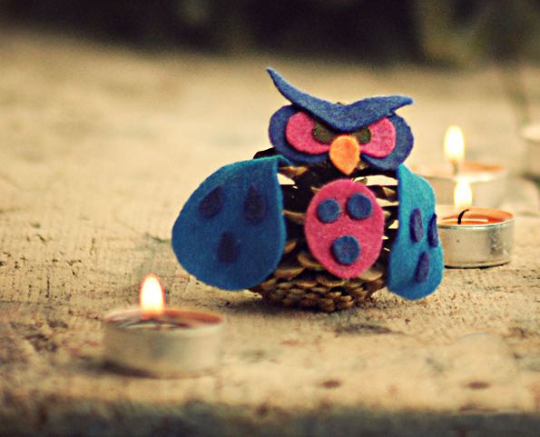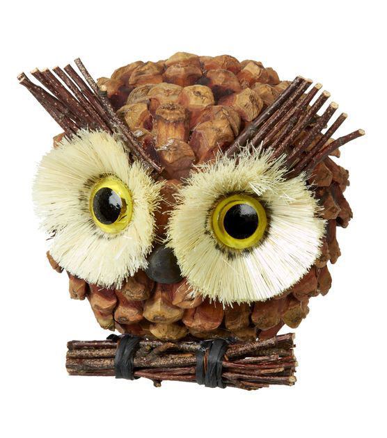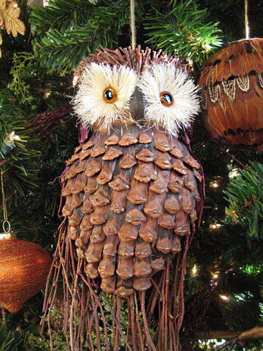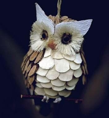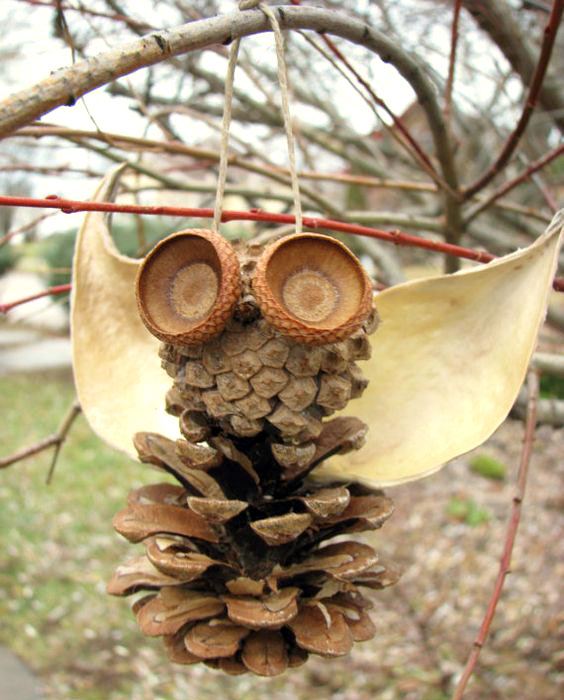 - Incollate delicatamente le foglie alla pigna, poiché la paraffina è fragile. Il gufo con pigne è pronto.
