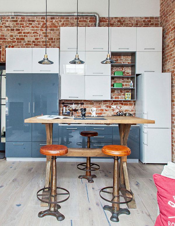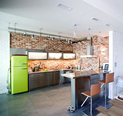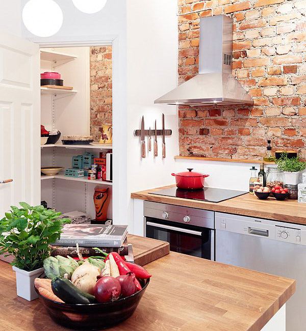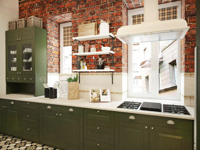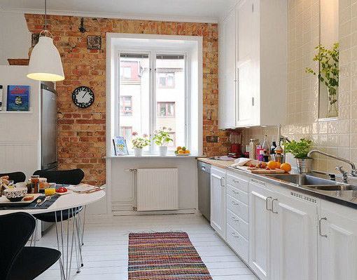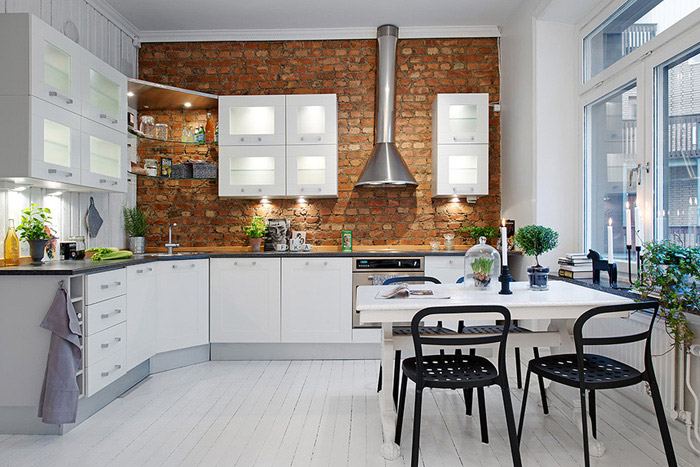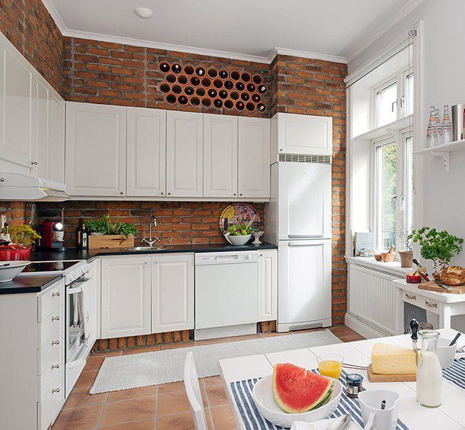 Voglio condividere alcuni progetti di cucine pronte con pareti in mattoni. Il terracotta in argilla si abbina perfettamente con mobili da cucina bianchi e finiture sobrie in stile scandinavo. Il colore dell’acciaio (elettrodomestici) e del bronzo (ferramenta) armonizzano bene. Il colore del mattone si abbina in modo interessante con mobili scuri, ma in tonalità contrastanti - verde scuro e persino nero. Tuttavia, quando si scelgono superfici scure, lo spazio deve essere ampio e luminoso, con soffitti alti.