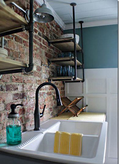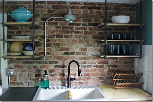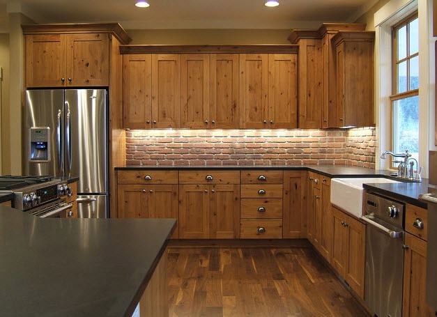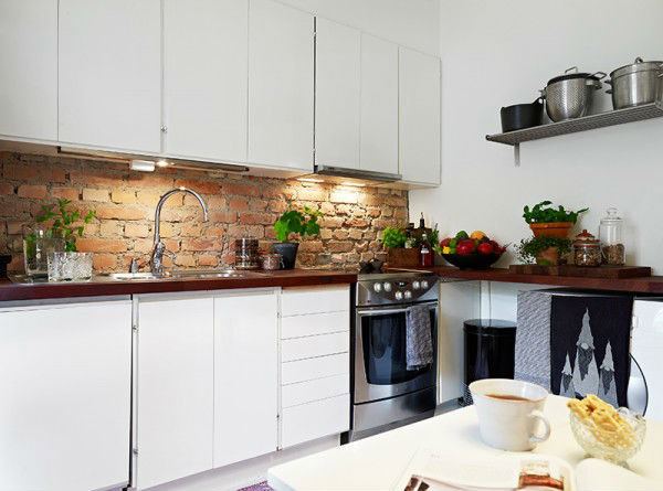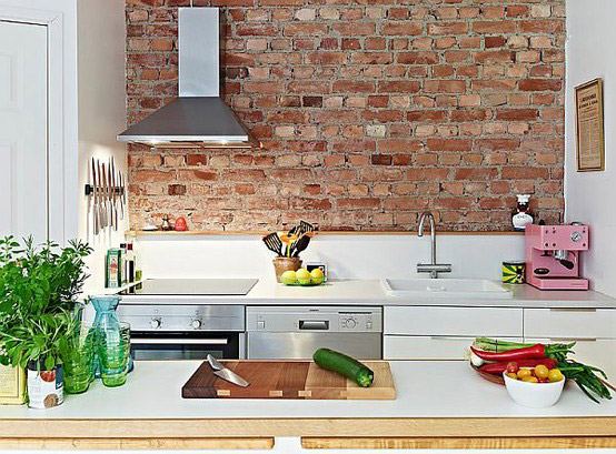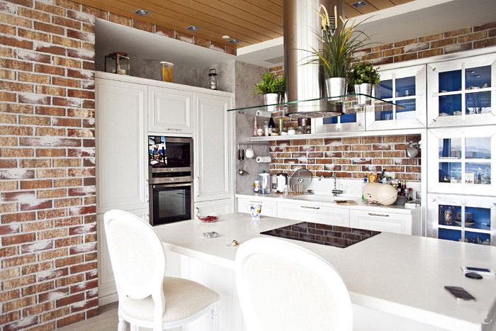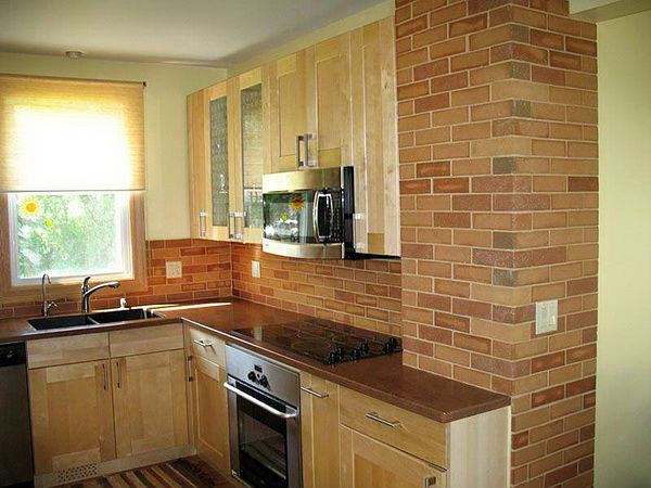 Il paraschizzi della cucina in mattoni necessita di un impregnante protettivo speciale. Il mattone nell’interior design richiede un’attenzione particolare. L’argilla è porosa e traspirante, quindi i suoi pori e fessure assorbiranno qualsiasi schizzi - grasso, detergenti, olio. Da un punto di vista pratico, questo non è un problema, poiché i carichi domestici sul mattone non possono portare a erosione, non saranno esposti al gelo, ma esteticamente le macchie di sporco sul mattone non piaceranno a nessuno.