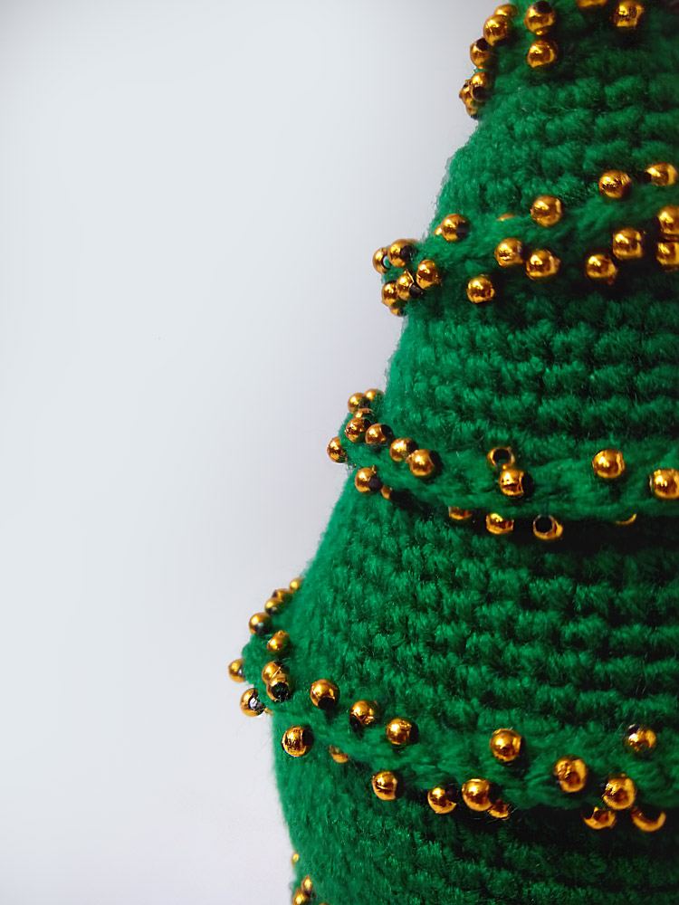 24段目は増し目なし。25段目: 10(+1) 26段目は増し目なし。27段目: 10(+1) 28段目: 10(+1) をチェスのように。29-30段目は増し目なし。31段目: 15(+1) 32-38段目は増し目なし。次に減らし目を始めます: 39段目 15(-1), 40段目 15(-1), 41段目 10(-1), 42段目 8(-1), 43段目 6(-1), 44段目 3(-1)。クリスマスツリーにわたを詰めるのを忘れないでください。仕上げに移ります。細編みでスパイラルに縁を結びつけます。