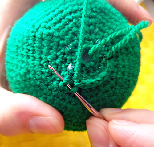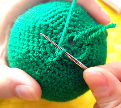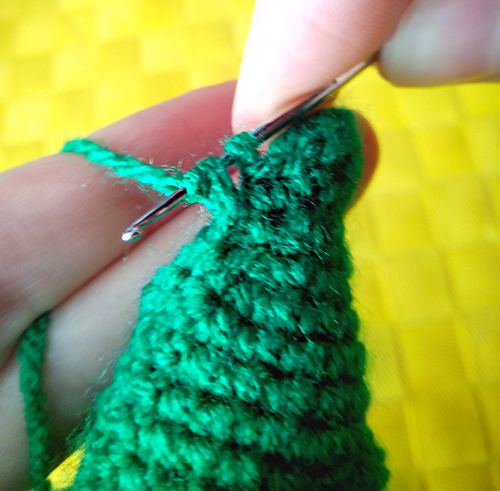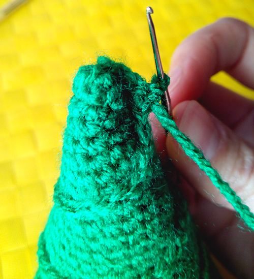 梨の形をしたフックで編んだクリスマスツリー。クリスマスのワークショップを続けます。今回は私たちの木の冠から編み始めます。アミグルミの輪に5つの細編みを編みます。