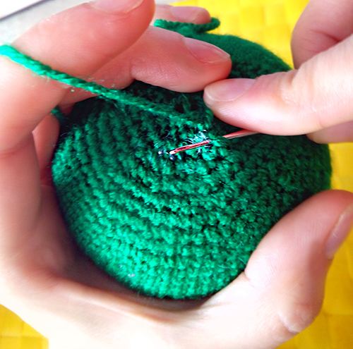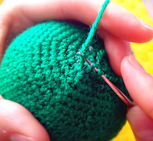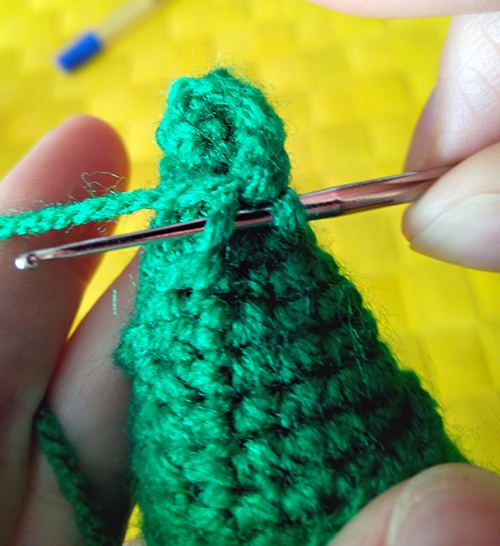 2段目: 2つの細編みと1つの増し目(+1) 3段目は増し目なし。4段目: 3(+1) 5段目は増し目なし。6段目: 5(+1) 7段目は増し目なし。8段目: 4(+1) 9段目は増し目なし。10段目: 5(+1) 11段目は増し目なし。12段目: 5(+1) 13段目は増し目なし。14段目: 5(+1) 15段目は増し目なし。16段目: 8(+1) 17段目は増し目なし。18段目: 10(+1) 19段目は増し目なし。20段目: 13(+1) 21段目は増し目なし。22段目 10(+1)