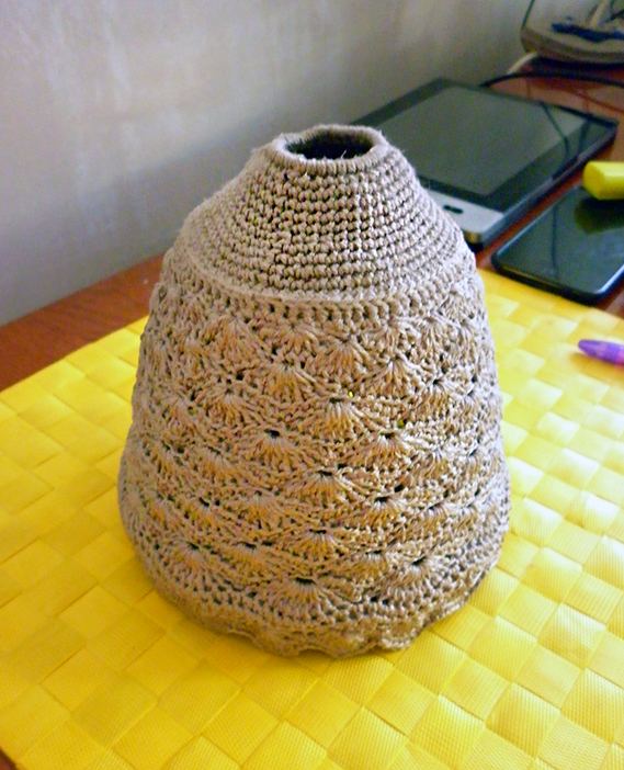 完全に乾燥させるのに最低24時間かかります。私は持ち手にカバーを編み、花モチーフも作ったのですが、今ではそれが余分に思えますが、もう遅いです… 今が一番複雑で手間のかかるステップです:ランプを組み立てます。
