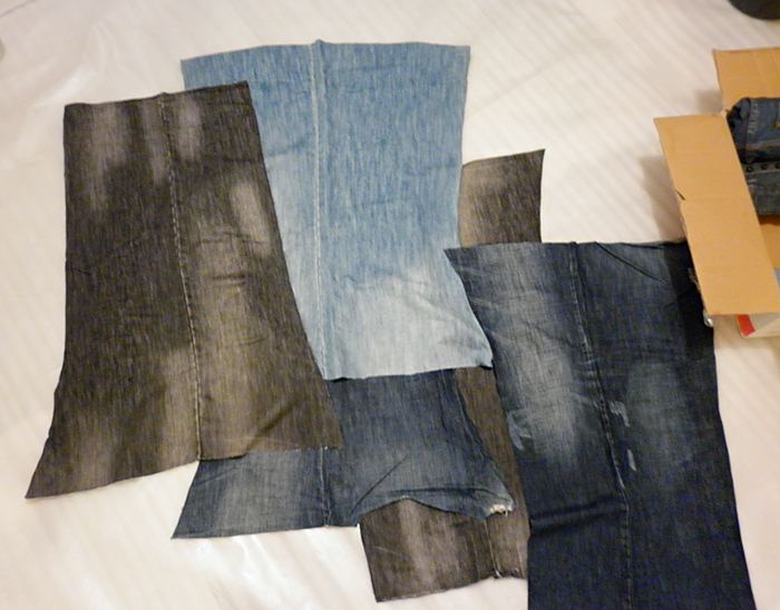 - 데님 바지의 바지통을 자르고 안쪽 솔기를 따라 뜯습니다. 만약 바지통의 크기가 충분하다면, 그냥 솔기를 잘라내어도 됩니다.