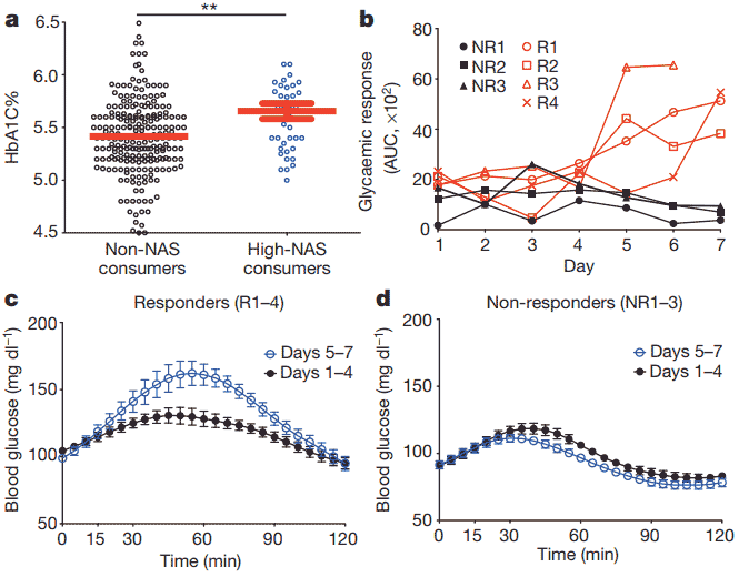 연구자들은 매일 사카린과 포도당 혼합물을 먹인 쥐들에서 특정 세균이 증식하며 포도당을 생성하는 것을 발견했다고 주장했다. 무균 쥐에게 실험대상 쥐의 대변을 이식하였고, 그들도 문제를 겪게 되었다. 이후 쥐들에게 항생제를 투여하자 효과가 4주 동안 사라졌다.