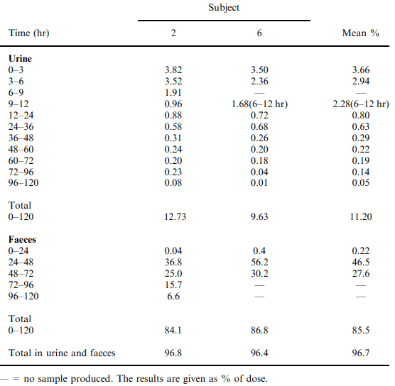 물질의 약리학적 동태와 약리학적 동작에 관한 연구는 2000년의 수크랄로스 대사 및 인간의 약리학적 동태 에서 잘 설명되어 있습니다. 배설 표는 거기에서 가져온 것입니다.