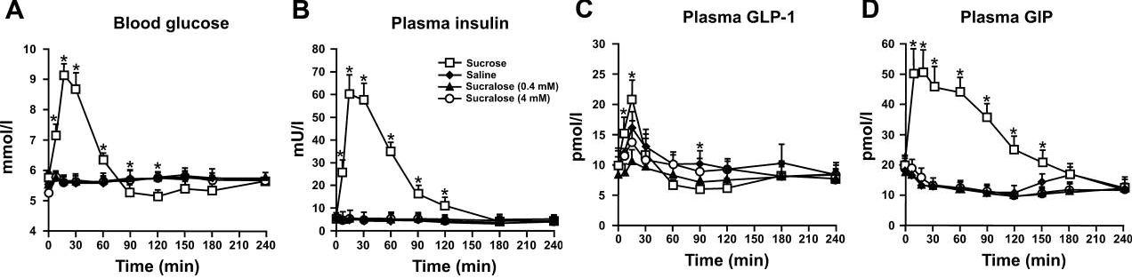 쥐에서 수크랄로스는 위장관 내의 단맛 수용체를 통해 인슐린 유사 호르몬의 분비를 유도하지만, 인간에서는 이 메커니즘이 훨씬 복잡했습니다 - 배합된 용액의 주입으로 인간의 인슐린 수치를 높이지 못했습니다 (33). 단순한 맛만으로는 충분하지 않으며, 탄수화물이나 포도당이 필요합니다.