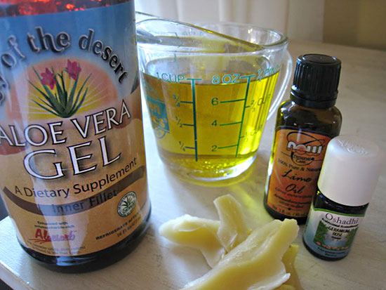 - 130 گرام ایلوویرا جیل (یہ مہنگا ہو سکتا ہے لیکن گھر میں بھی حاصل کیا جا سکتا ہے۔ یہ ایلوویرا کے پتے کا اندرونی حصہ ہے)۔ اگر جیل دستیاب نہ ہو تو اسے نباتاتی گلیسرین یا ایلوویرا کے رس سے بدلا جا سکتا ہے۔ گھر میں اگنے والی ایلوویرا کی اقسام کم موثر ہو سکتی ہیں لیکن انہیں بھی استعمال کیا جا سکتا ہے۔